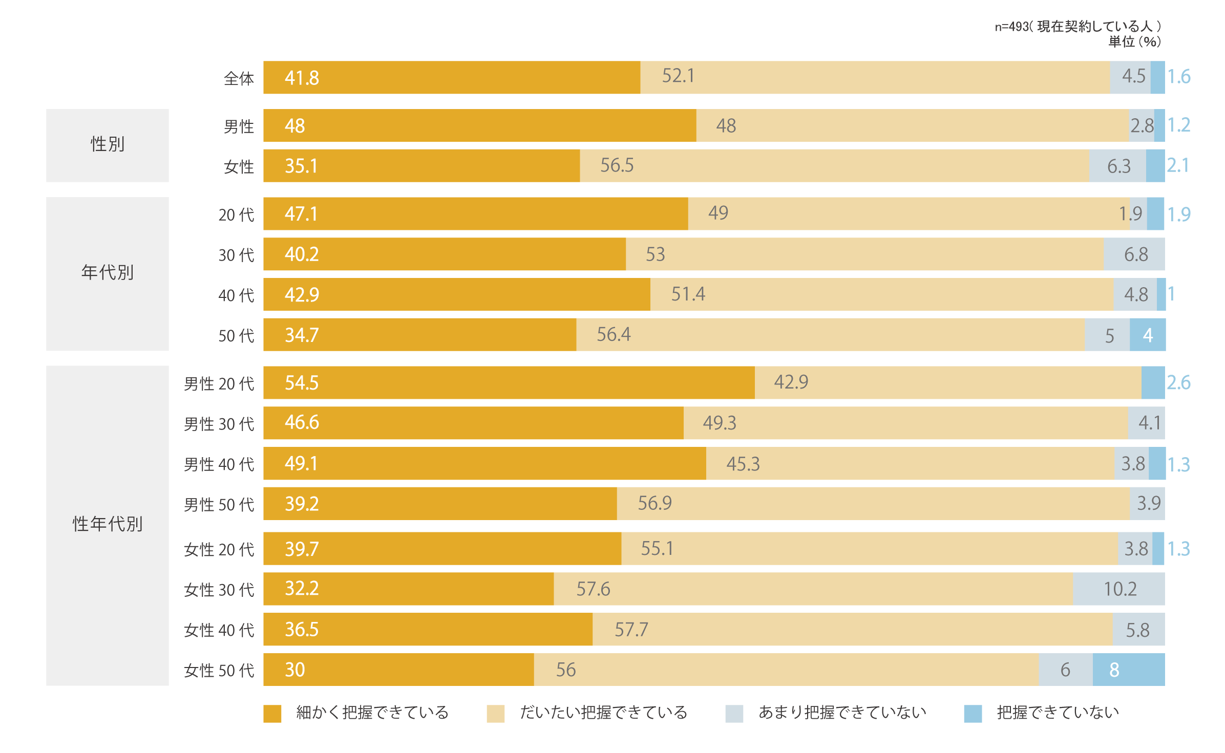 性年代別でみると、男性20代は「細かく把握できている」割合が特に高いことが結果から見られた。