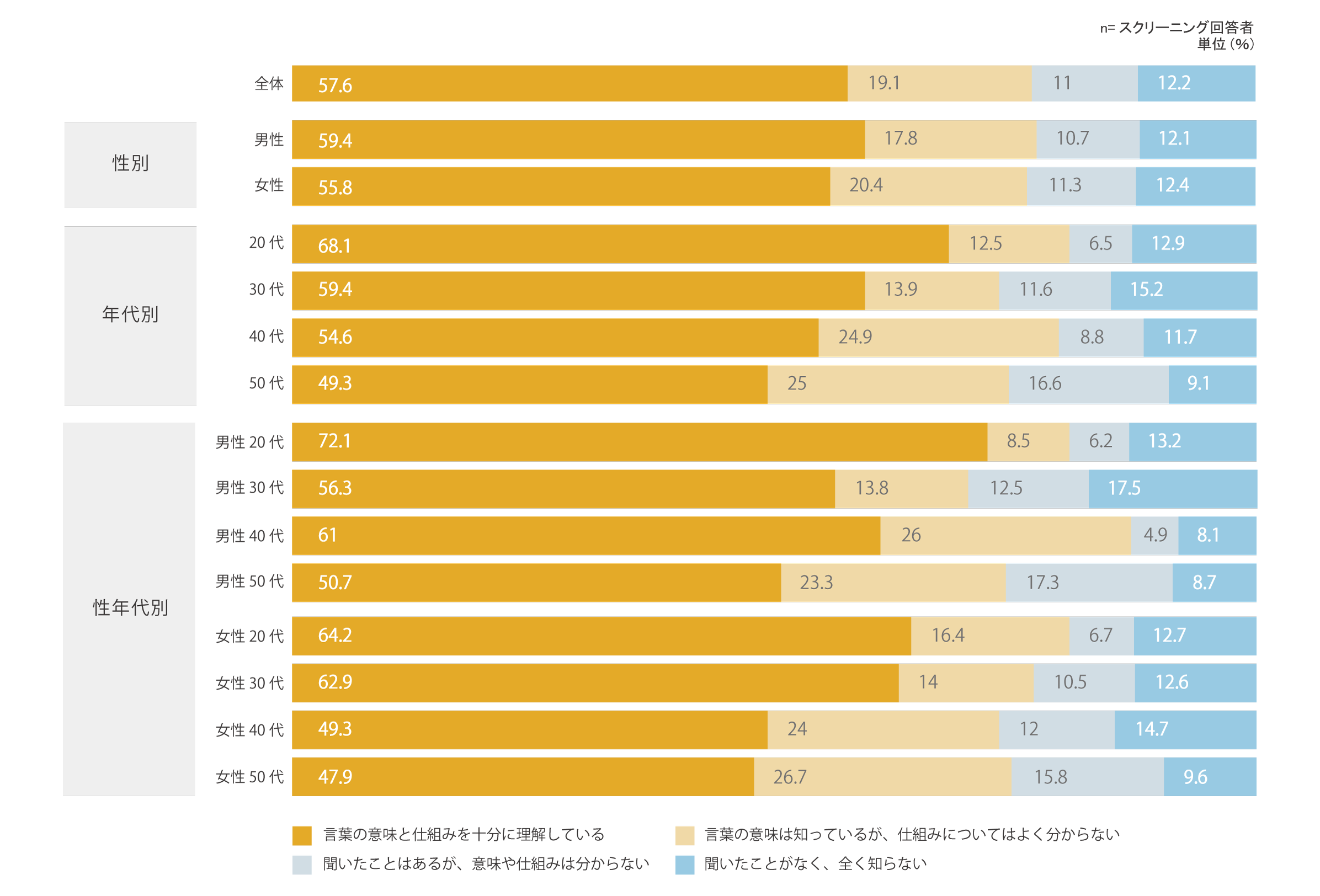 特に、性年代別では男性の20代が最も高い理解度を示している。