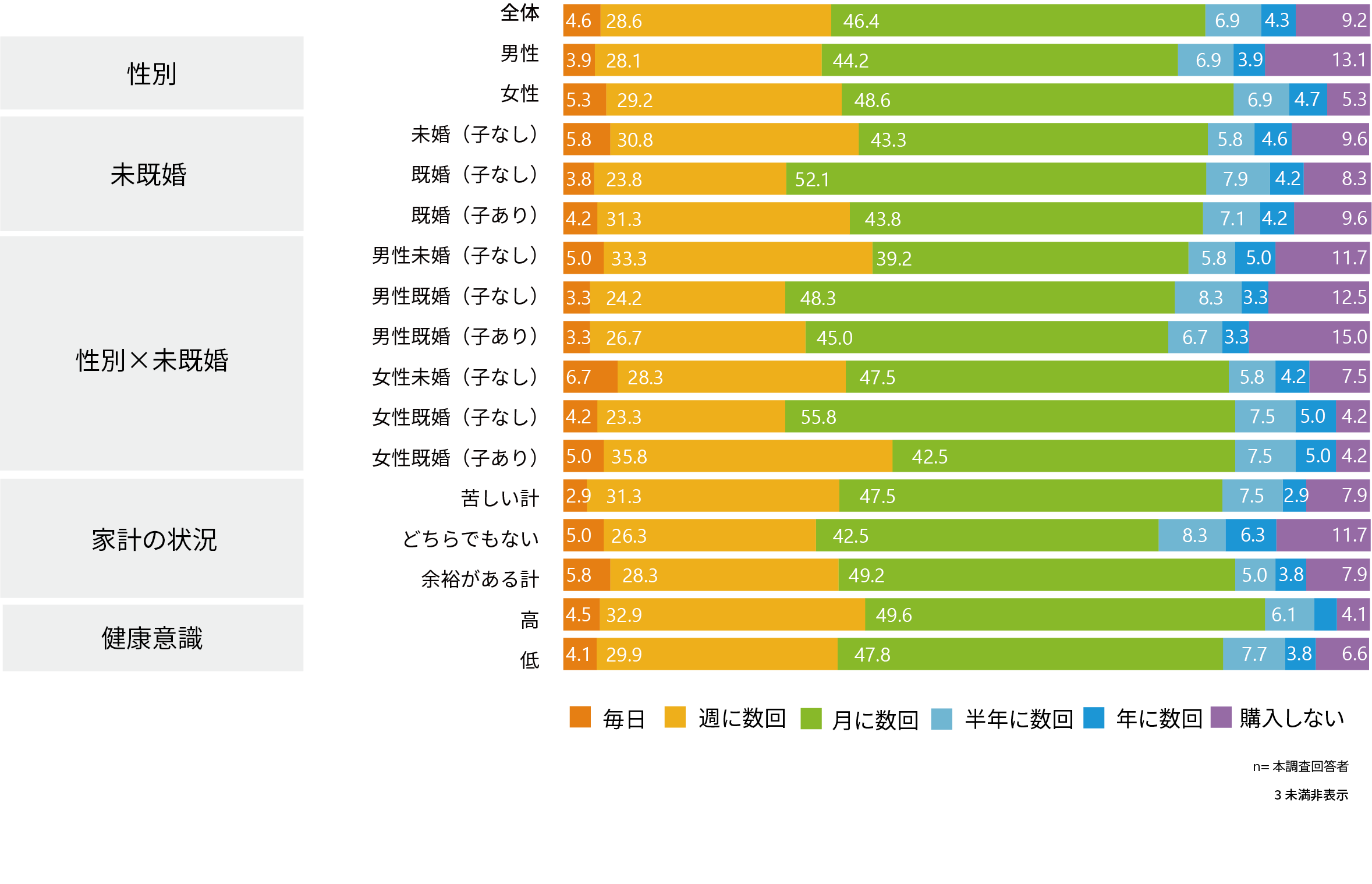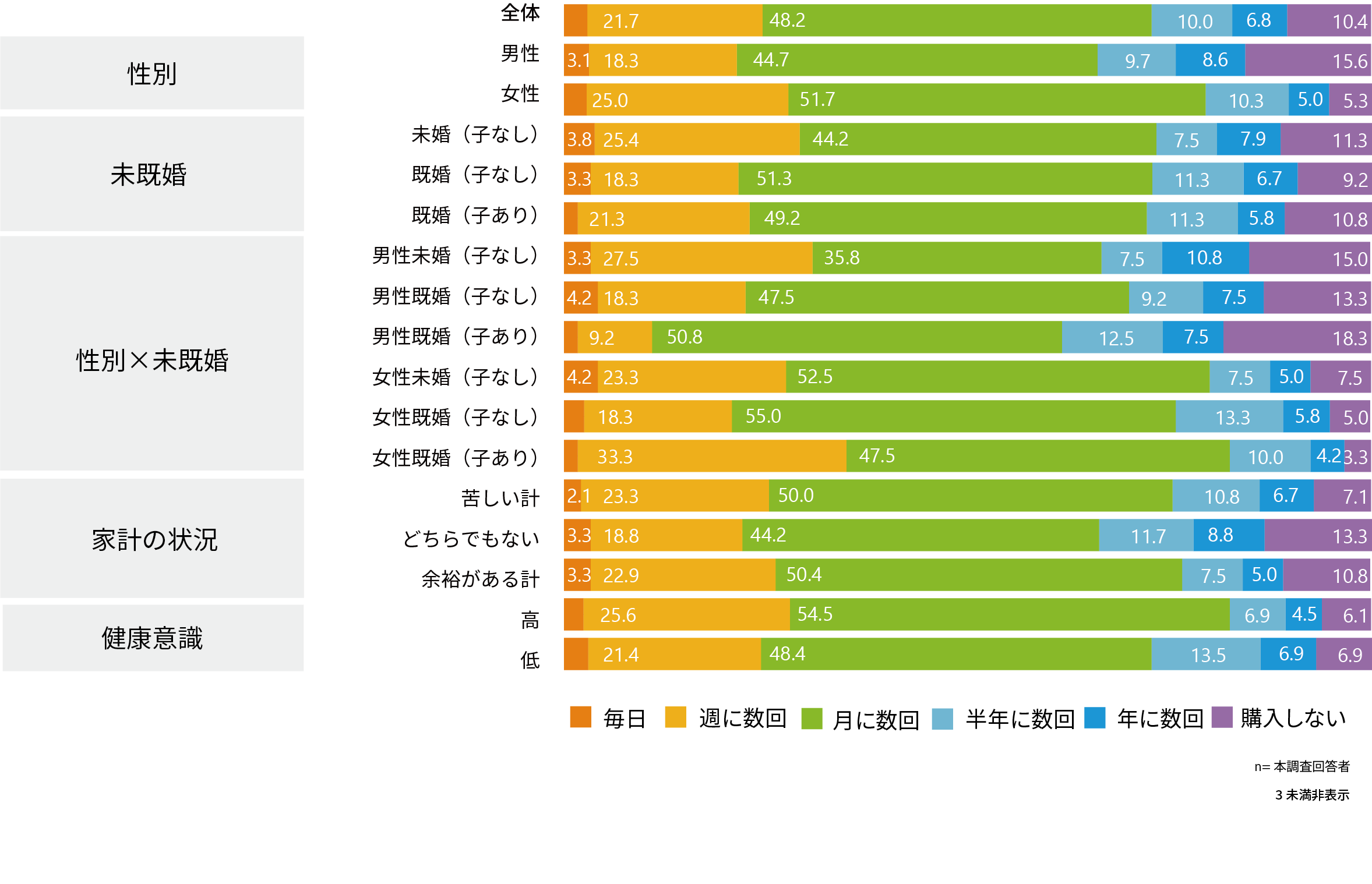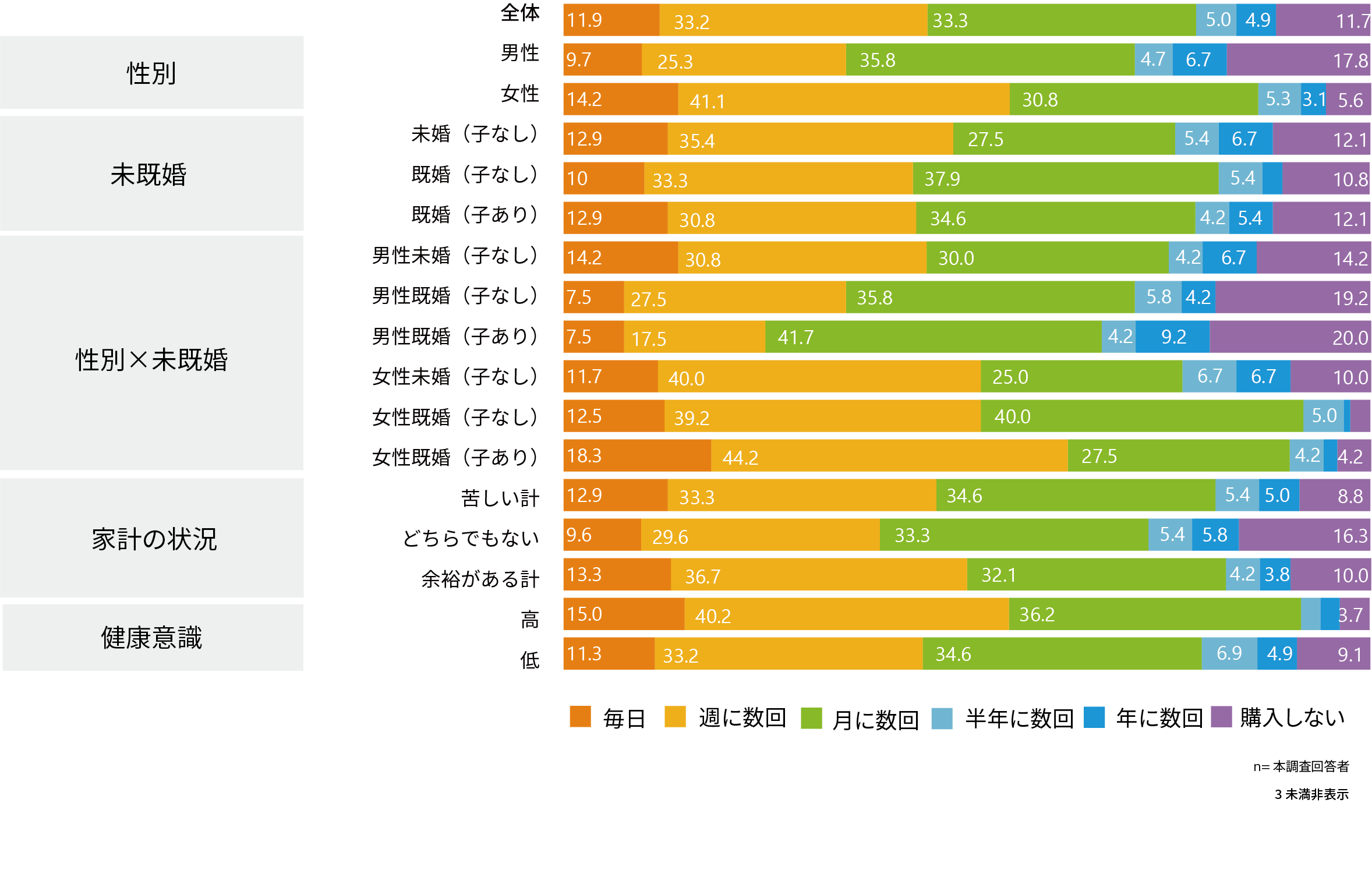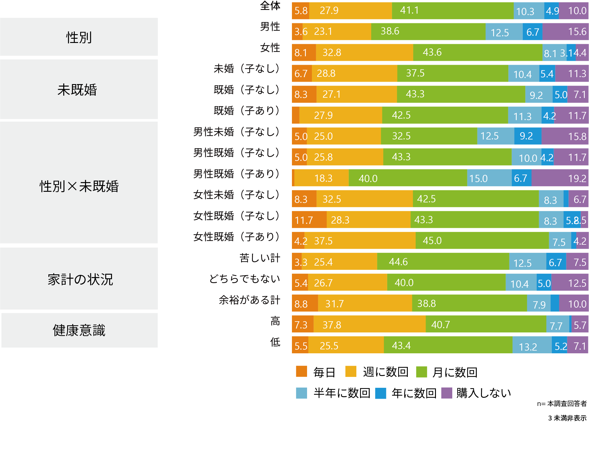 男性既婚(子あり)層の「購入しない」割合が他の層より高いのに対し、女性既婚(子あり)層は「週に数回」「毎日」購入する割合が他より高い。