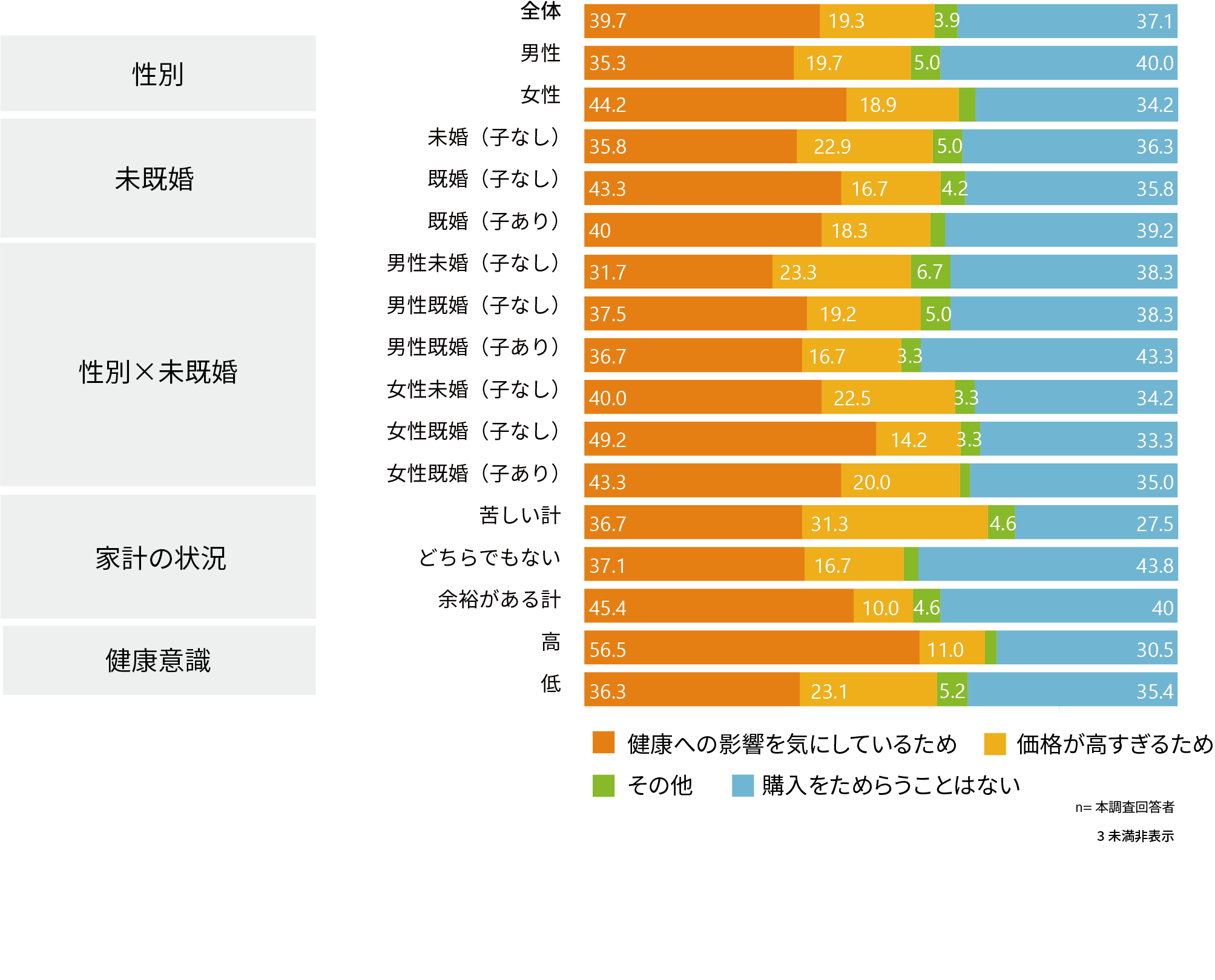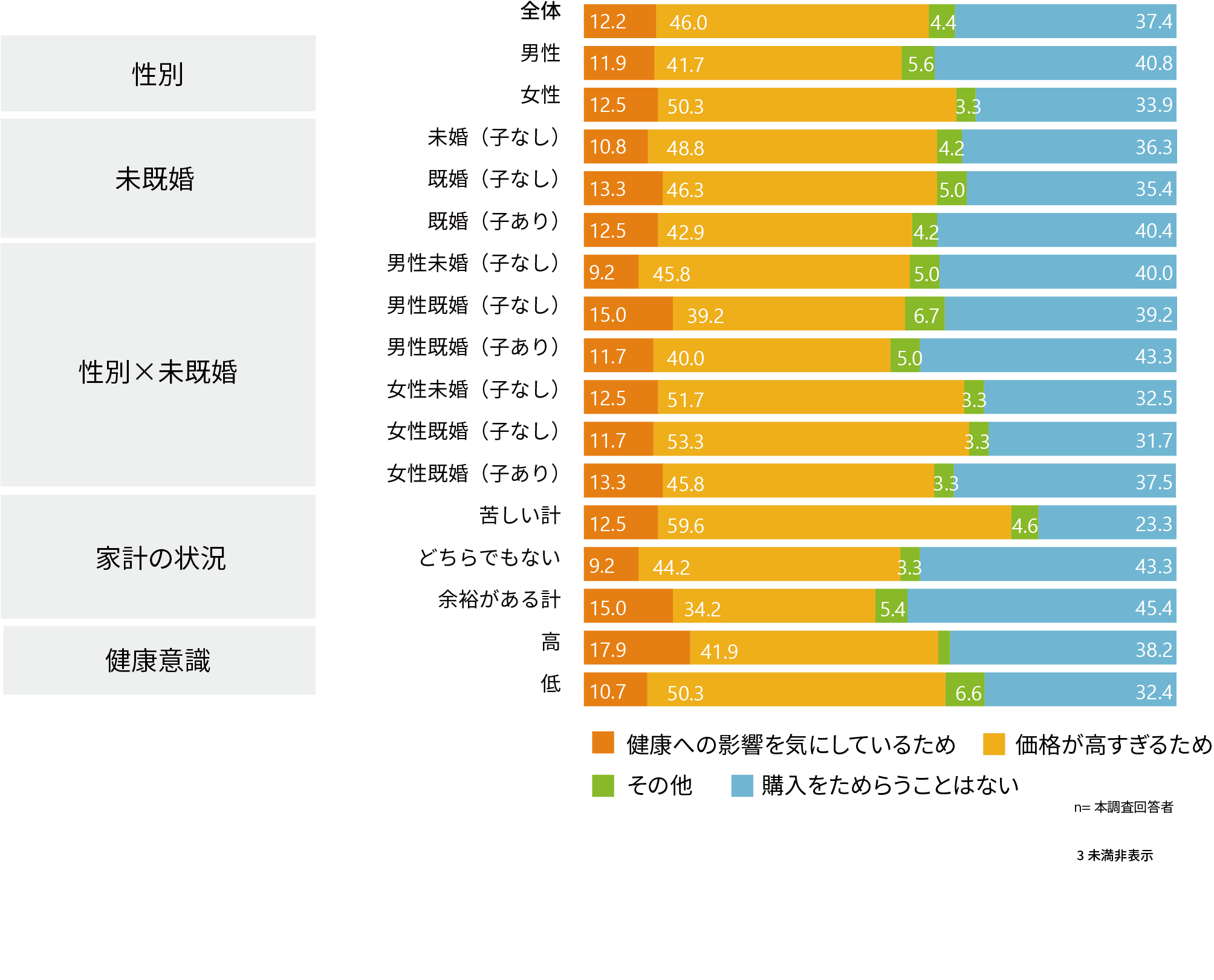 お菓子と同様の傾向で、健康意識が高い層で「健康への影響」、家計の状況が苦しい層で「価格が高い」ことがためらう理由となっている。