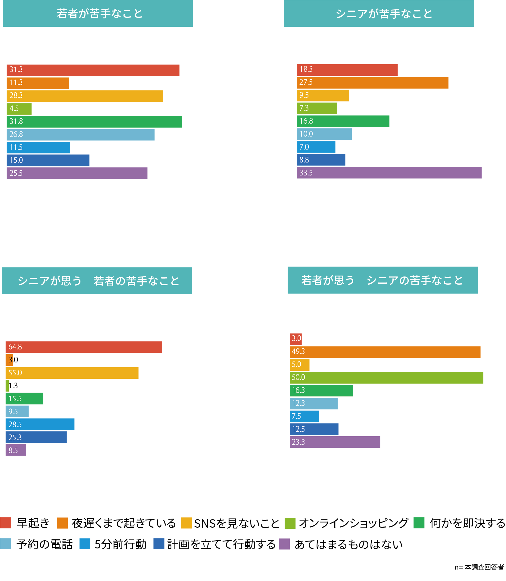 若者の半数が「シニアはオンラインショッピングが苦手」と思っていたが、実際に苦手と答えたシニアは7.3%だった。シニアの60%以上が「若者は早起きが苦手」と思っているが、実際は30%程度の人が苦手と回答するにとどまった。