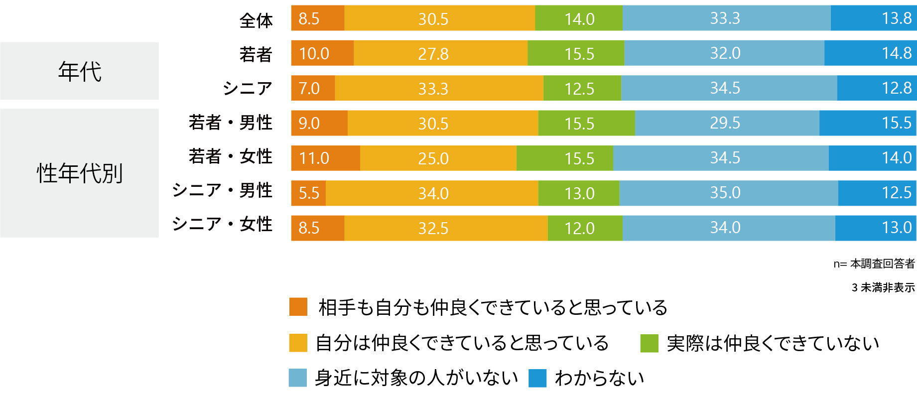 実際の仲の良さについては、若者・シニア共に30%以上が「身近に対象の人がいない」と回答しているが、同程度の割合で「自分は仲良くできていると思っている」と回答している人もいる。