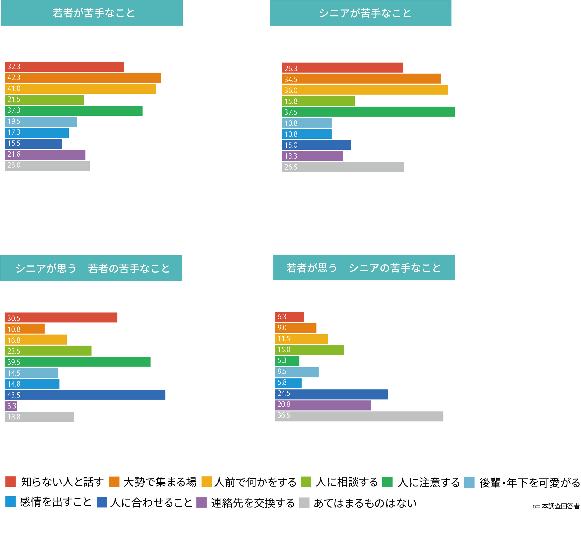 - 対人関係の中で若者はシニアが「人に注意をすること」を苦手ではないと思っていたが、実際はシニアの約40%が苦手と回答