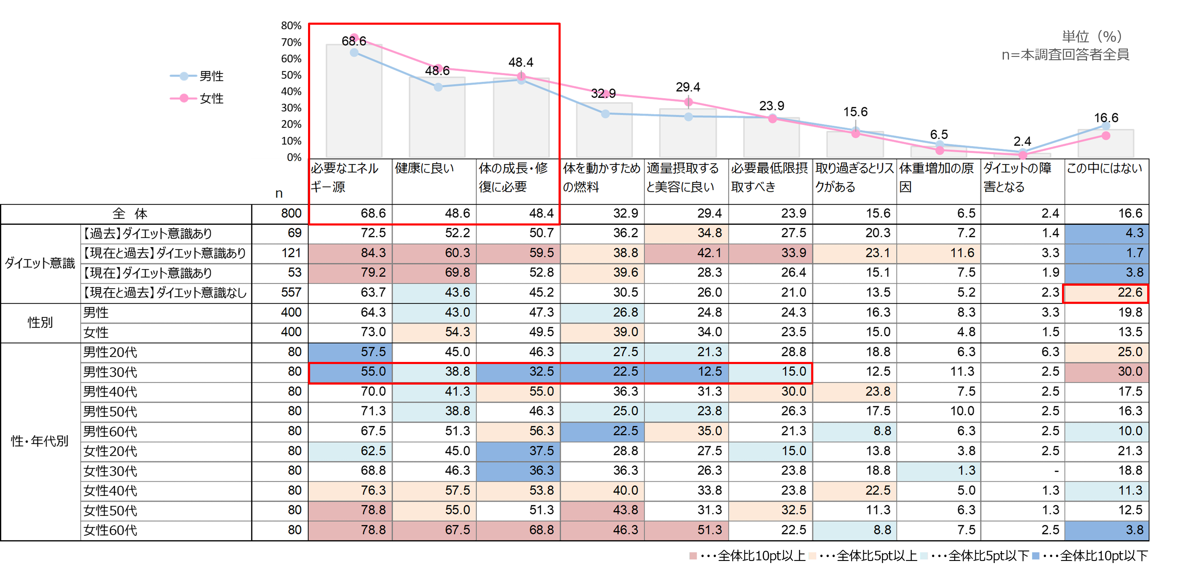 全体では、「必要なエネルギー源」が7割弱と最も高く、次いで「健康に良い」、「体の成長・修復に必要」と続く。ダイエット意識でみると、現在も過去もダイエット意識なしの回答者は「この中にはない」が2割強と高い。性・年代別でみると、男性30代はたんぱく質に対してポジティブなイメージが低い。