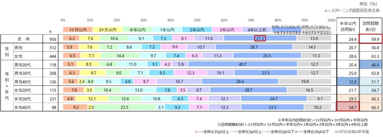 性年代別でみると、『女性40代』は他の年代に比べて半年以内の訪日が高く、直近の旅行者が多い。