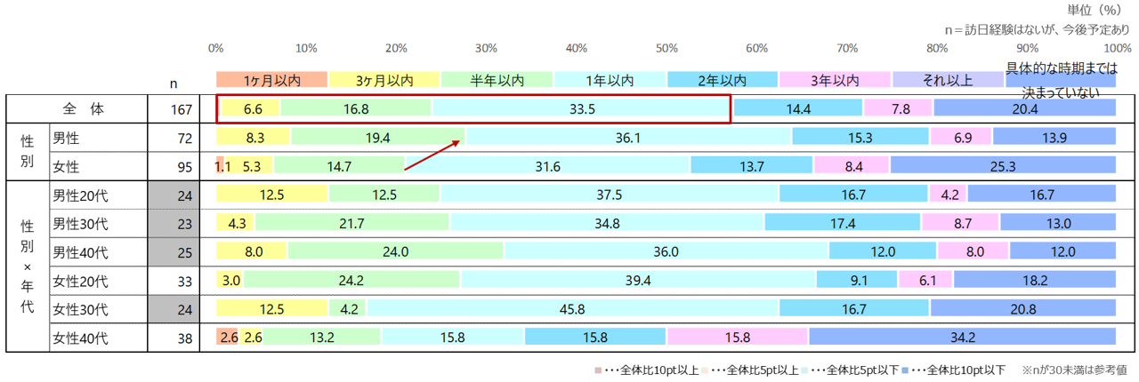 性別でみると、『男性』は『女性』よりも半年以内の訪問意向が高い。
