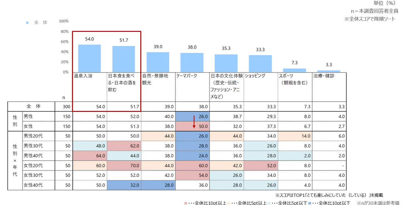 - 訪日での楽しみは「温泉入浴」が最も高く、「日本食を食べる・日本の酒を飲む」がそれに続く