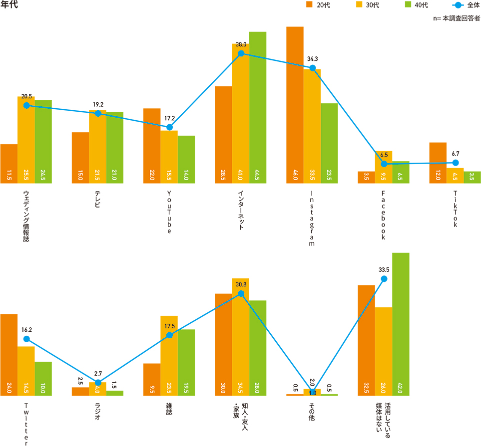 - 結婚式の情報収集、20代はSNS、30代は情報誌・雑誌、40代はインターネット