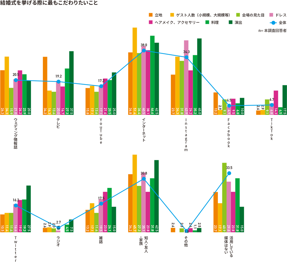挙式の際のこだわり別でみると、「立地」にこだわりたい層はテレビを情報源とし、Instagramの活用は少ない傾向。「ゲスト人数」にこだわりたい層は、情報誌、インターネット、知人・友人・家族を情報源とする傾向が高い。「演出」にこだわりたい層は、テレビ、Instagram、Twitter、雑誌と幅広く活用している傾向がみられる。