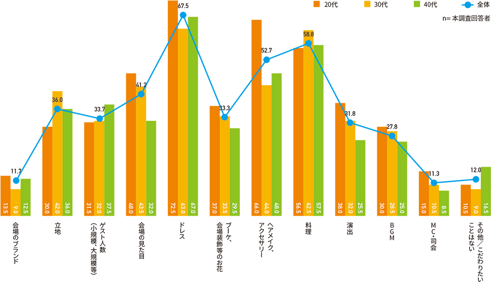※「会場のブランド」「ブーケ、会場装飾等のお花」「BGM」「MC・司会」はサンプルサイズが小さいため、グラフから割愛。