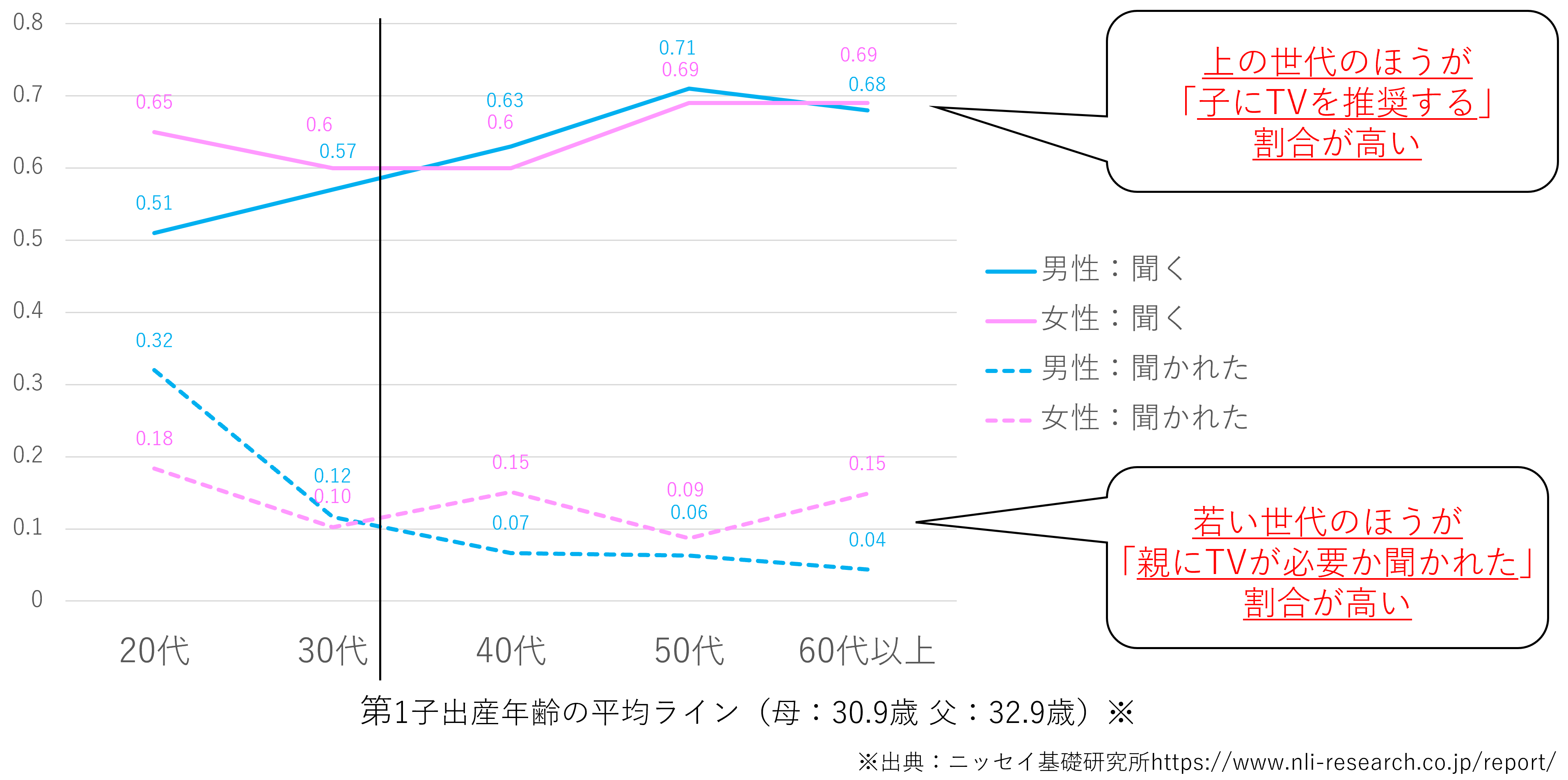 下のグラフは、「子にテレビ購入を推奨する割合」が実線、「親からテレビが必要か聞かれた割合」を破線の折れ線で、男女別で表したものです。そして、「子にテレビ購入を推奨する割合」を調査するために伺った際、子供がいない対象者もいたので、「お子様がいる親という立場」という質問の仕方、つまり「もし子供がいるならば」というif条件の上で聞いた質問にしました。そのため、グラフに黒い縦線を引いており、これは第1子出産年齢の平均値です。黒線の左側は比較的子供がいる率が少なく(“もしも”で答えている割合が高く)、右側は子供がいる率が高いというガイドラインとなります。
