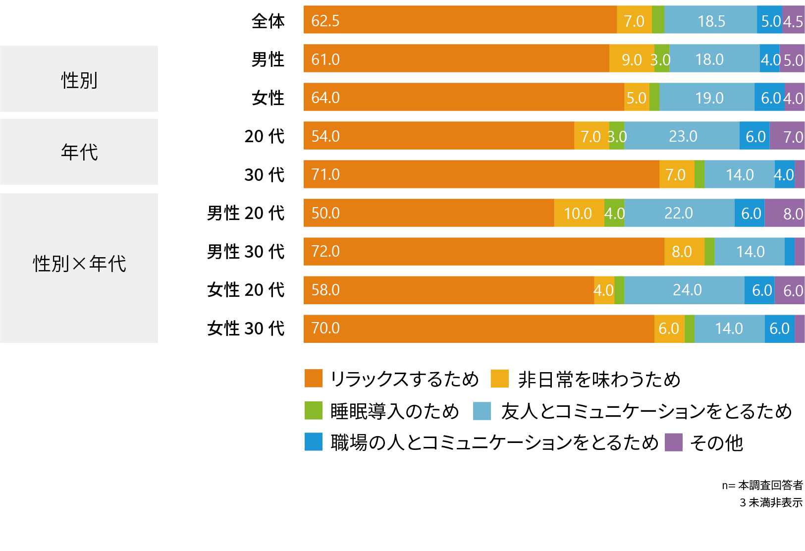 性別で大きな差は見られないが、年代別でみると「リラックスするため」(71.0%)が20代より30代のほうが20pt以上高い傾向が見られる。