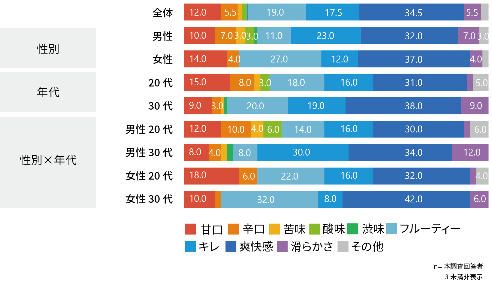 女性30代は"味"で「フルーティー」(32.0%)の支持最も高く、男性30代からの支持は最も低い(8.0%)。