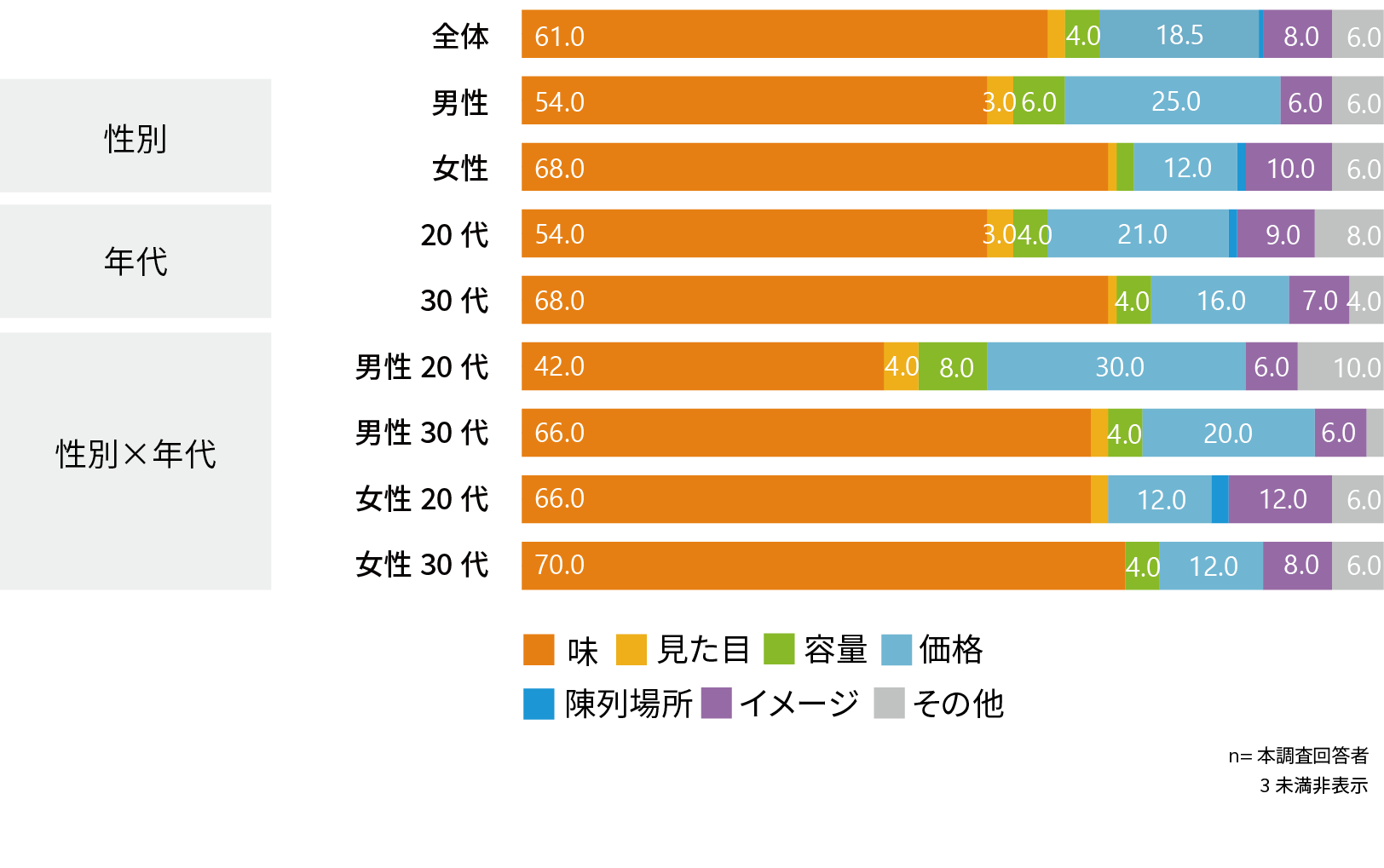 全体でみると普段日本酒を購入しない理由として6割以上の人が「味」と回答し、 次に多い「価格」(18.5%)の3倍以上であった。 性年代別で見ると、20代男性は「味」が顕著に低く、代わりに「価格」が顕著に高い傾向が見られる。