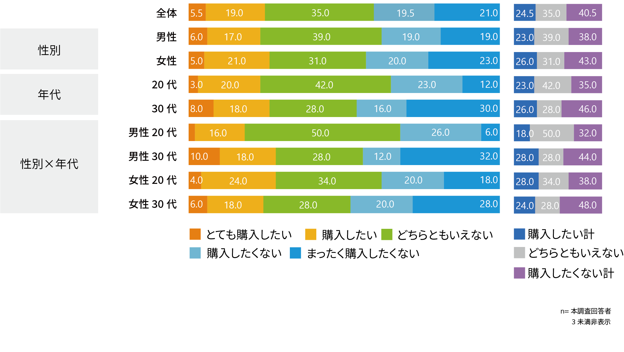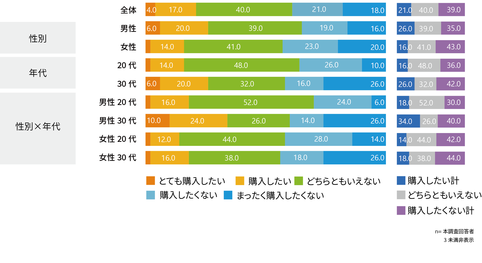 性年代別で見ると、30代男性の3割以上が「購入したい」と答え、他と比べて高い。