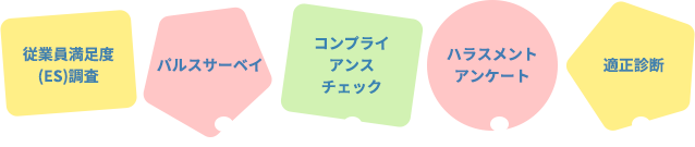 従業員満足度(ES)調査、パルスサーベイ、コンプライアンスチェック、ハラスメントアンケート、適正診断など