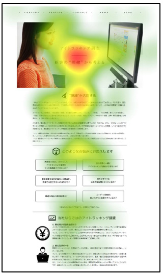サーモグラフィーのようなグラデーションで、全体的にどの場所がよく注視されたかを知ることができます。