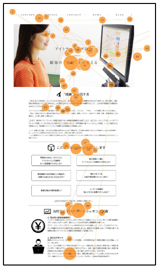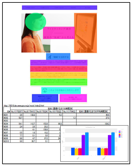 WEBサイトのユーザビリティ最適化のため、メガネ型機器を使用し、WEBサイト内でのミッション(製品の購入など)をあたえ、視線の動き・注視個所などを数値化+事後インタビュー。