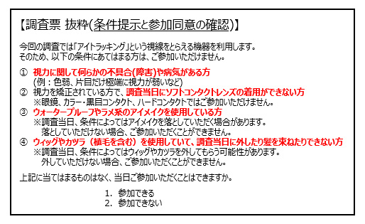募集段階で、正しく視線を計測できない条件を提示し、回答者が条件に当てはまらないか、また当てはまっていても、調査当日に視線を計測できる状態に調整可能かどうかを聴取し、調査への参加の同意を確認致します。また対象者へは募集段階で、条件確認と前日確認の2回、架電・メール等による条件の最終確認を実施しております。条件違いの対象者、視線を計測できない対象者が来てしまわないように最大限努めさせていただきます。