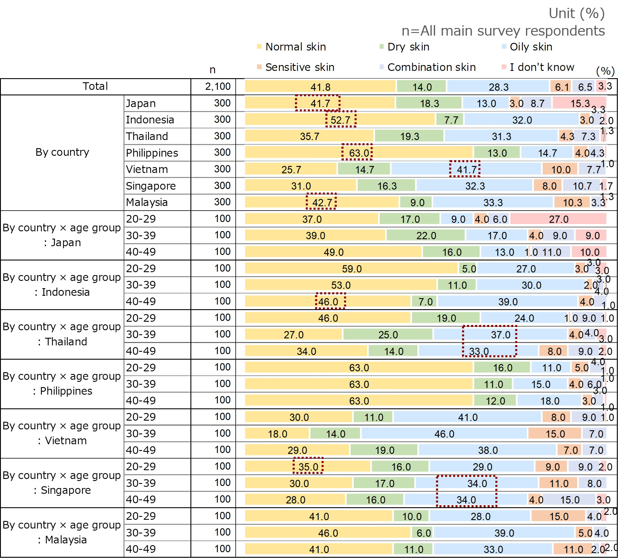 In Thailand and Singapore, a large proportion of men in their 20s have "normal skin" while a large proportion of men in their 30s and 40s have "oily skin".