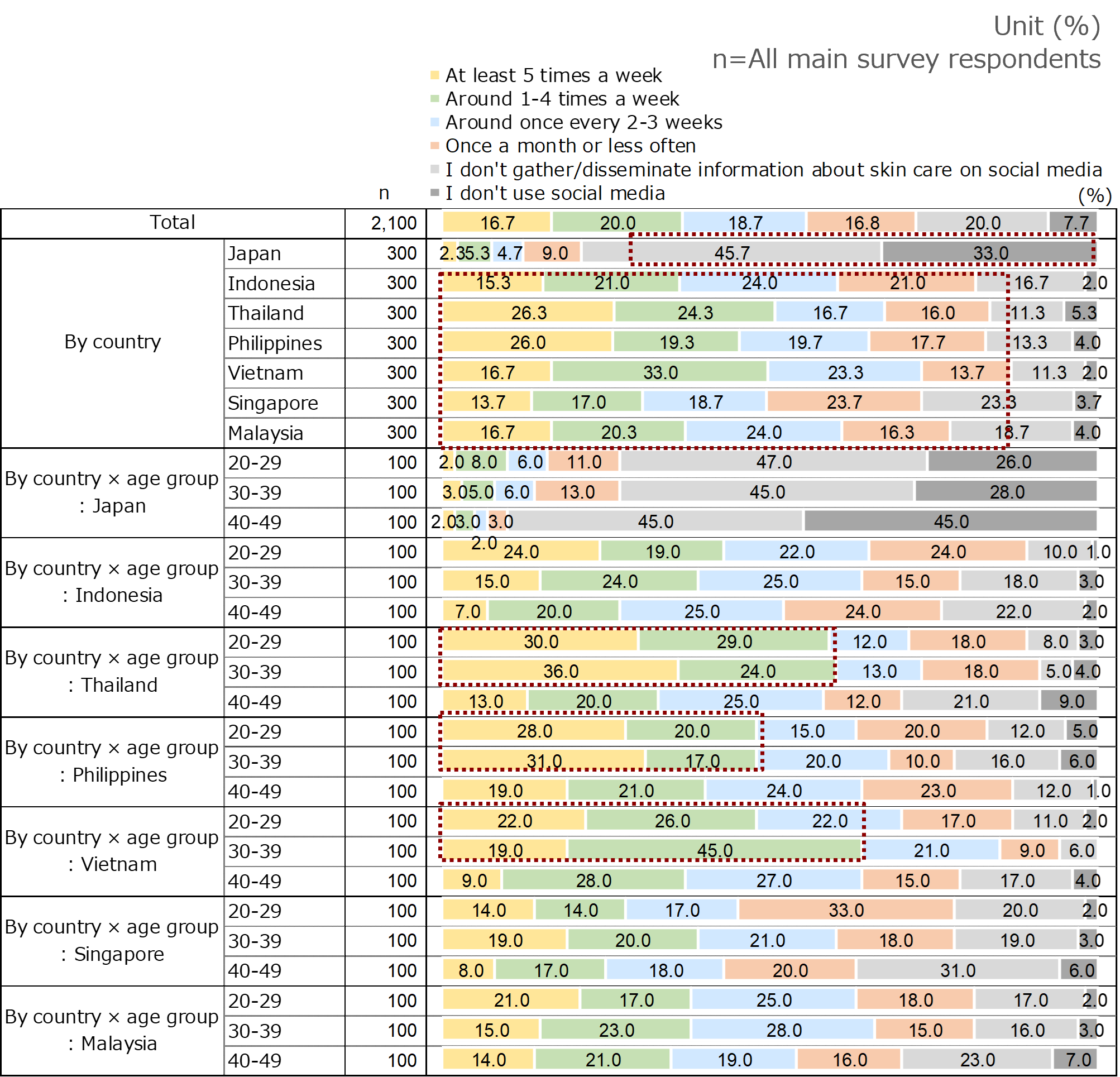 Many men in Japan do not use social media, and of those who do, the majority do not gather information about skin care on social media. On the other hand, the use of social media to gather information about skin care is common in the other countries and men in their 20s and 30s in Thailand, the Philippines and Vietnam tend to gather information with particularly high frequency.
