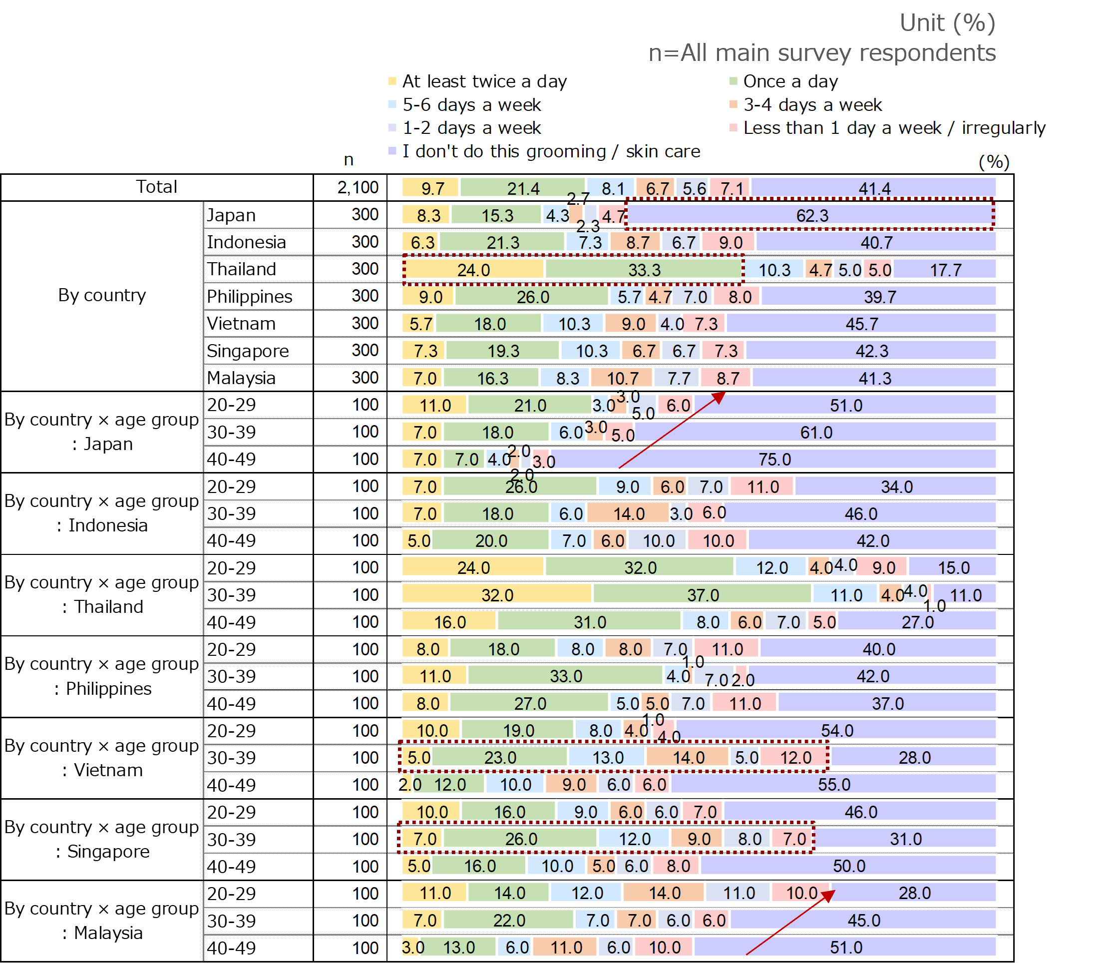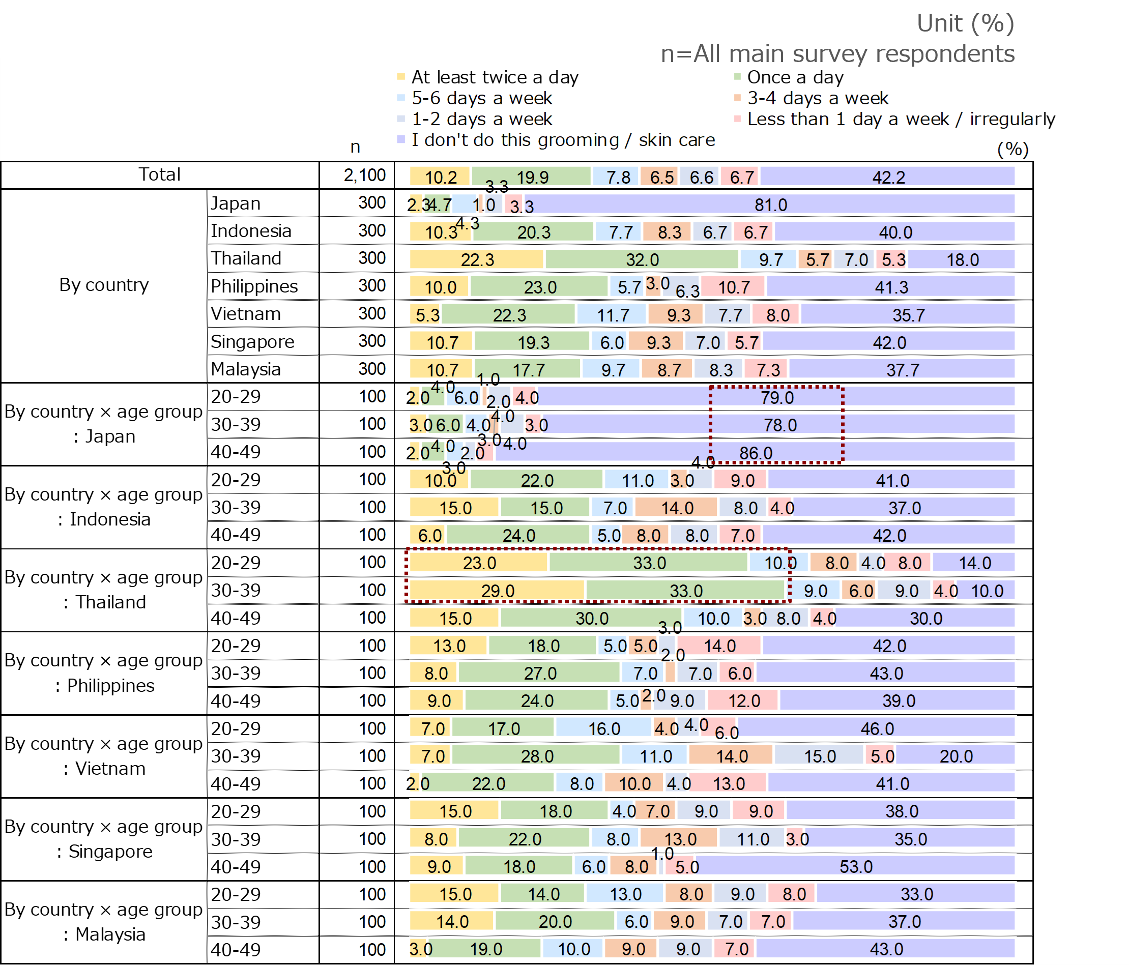 30% or more of men in each country other than Japan are using cream at least once a day. Usage is particularly high among men in their 20s and 30s in Thailand.