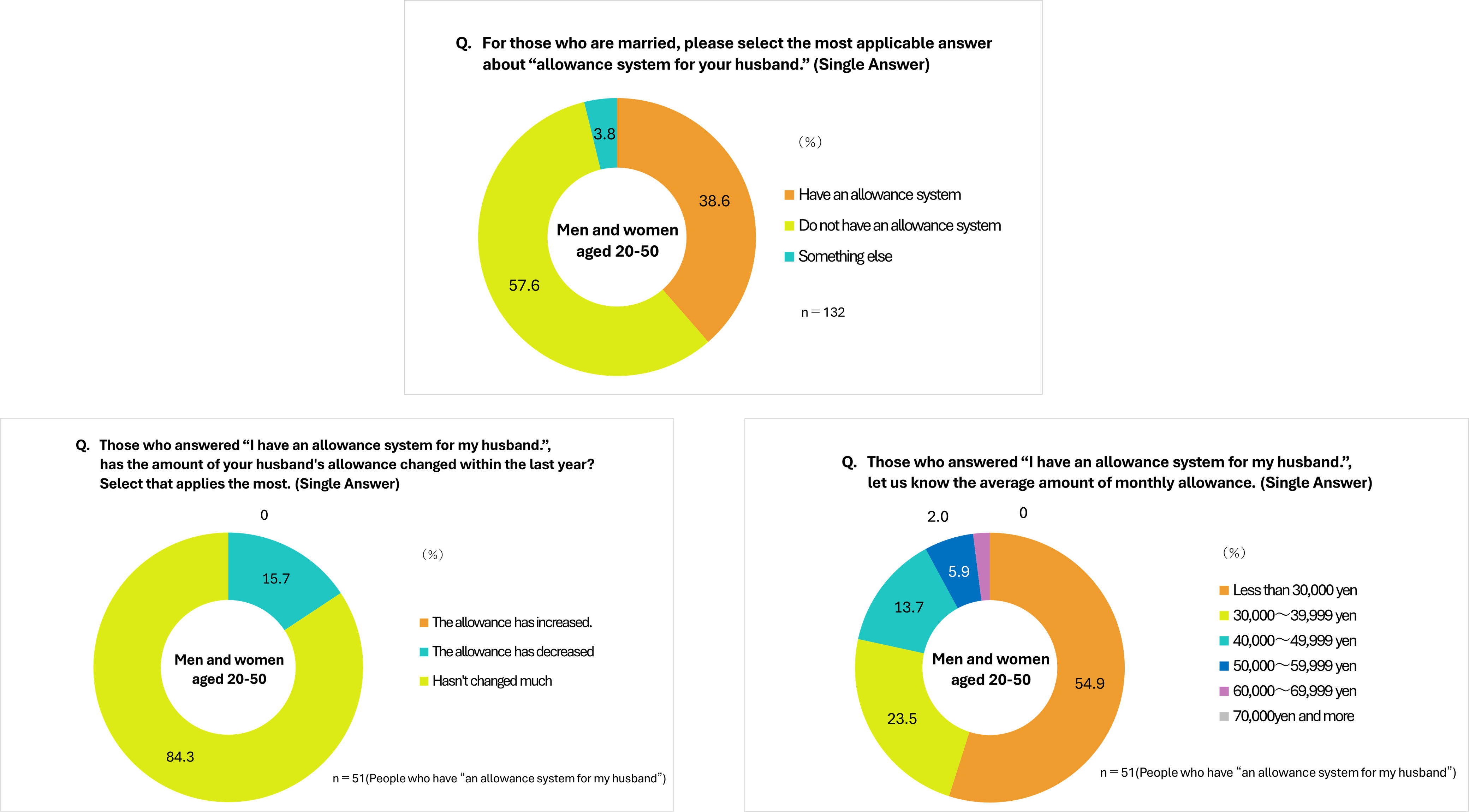 First, we asked those who have an allowance system how much money they allocate for their husband, and found that more than half of them set the price at less than 30,000 yen. Although It might depend on the area they live in and the range of use the allowance, many people seem to manage their household finances carefully.