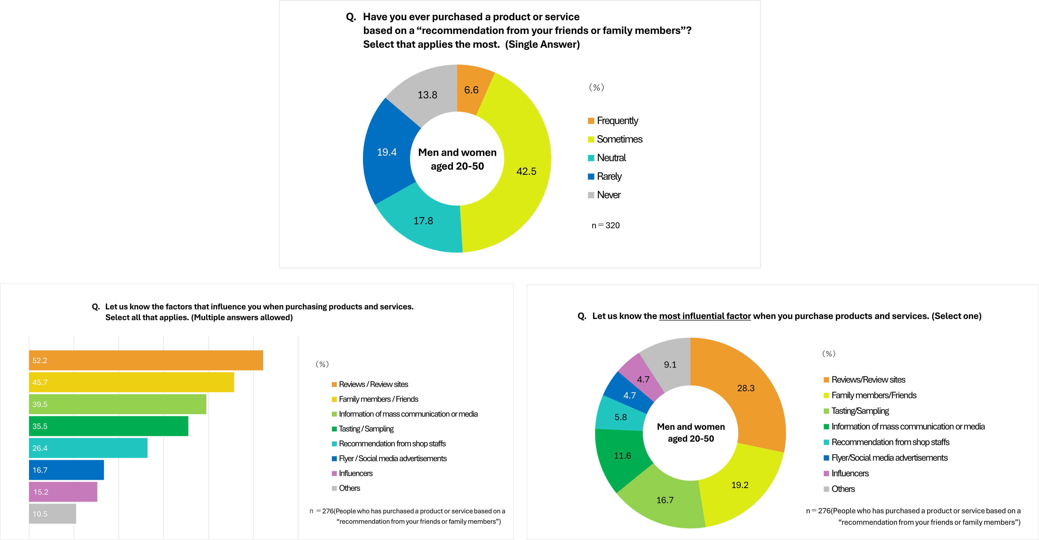 Many people purchase a product or service based on an influence of their friends or family members, with over than 40% of all respondents. 20% of them “friends/family members” are the most influential.