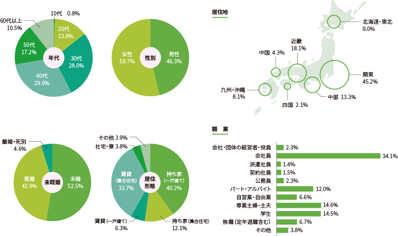 モニター数は人づてに拡がり、現在では全国に 100 万人以上の良質なモニターが揃っています。参加型の定性調査から始まったモニター事業であるため、パネルの協力率が高いことも特徴の一つです。