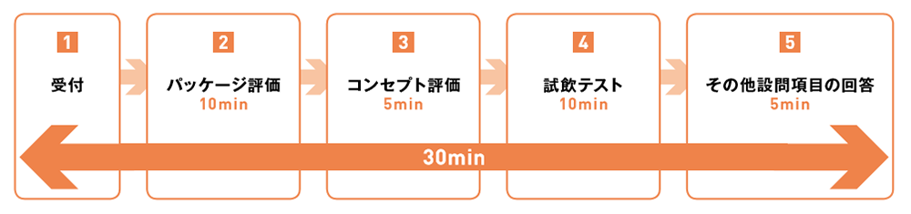 「受付、パッケージ評価、コンセプト評価、試飲テスト、その他設問項目の回答」という流れで当日は進んでいき、30分程度が目安です。