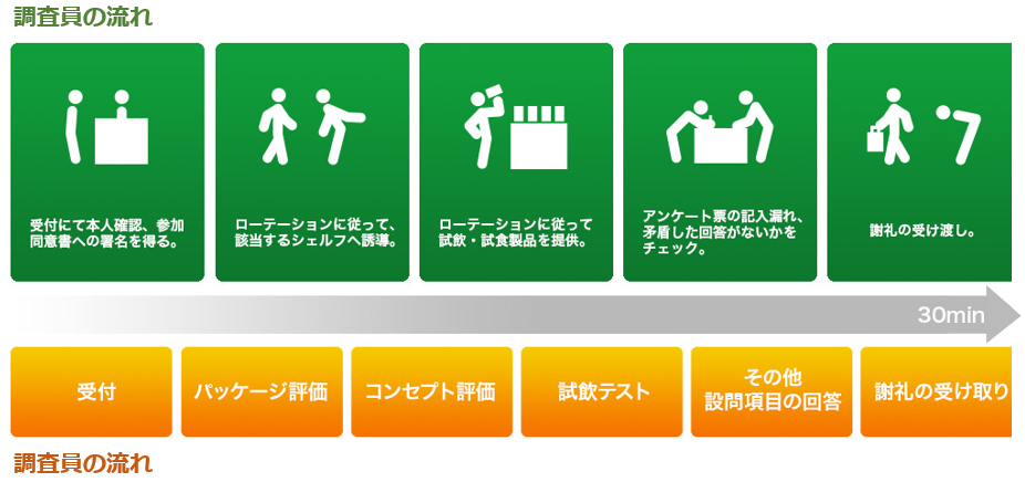 会場調査当日は、調査員を上手くコントロールすることが重要です。調査員の人数は調査の内容・ボリューム・タイムスケジュールによって決定します。 会場調査の調査員の役割は、主に対象者へのアンケート記入方法の説明・回答に誤りがないかのチェック、試飲(試食)品の提供、回答ブースへの案内などです。