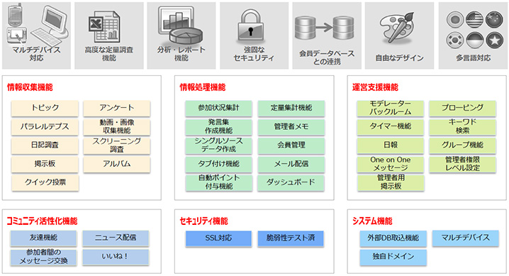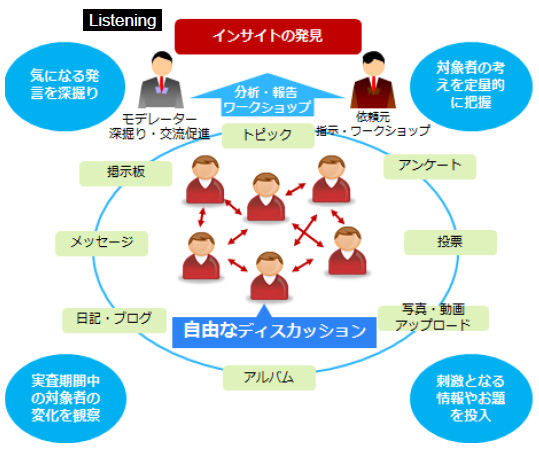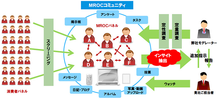オンライン上で「商品・企業・ブランド等に詳しい人や興味のある人」を集めて、 「クローズド」な「マーケティングリサーチ専用のコミュニティ」を構築し、「生活者×生活者」、「企業⇔生活者」の対話の場を設定。 そのコミュニティの中で「定性調査(ディスカッションほか)」と「定量調査(アンケートなど)」を組み合わせ、繰り返し進めることで、 消費者のインサイト(深層欲求)を抽出する、リサーチ手法です。