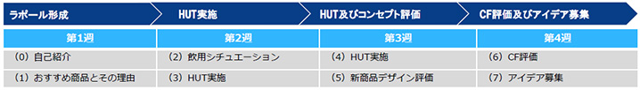同一カテゴリ商品のファンが集まり、第1週目を比較的自由なコメントが生まれるように設定したため、ラポール形成が上手く行った。 HUTでは少々の脱落もあったが、1コンセプトにつき2日間ほどの時間をかけた事により対象者同士の様々なコミュニケーションが見られた。 アイデア募集を最後に持ってきたことにより、約4週間の期間で得た様々な刺激から斬新なアイデアや思いもよらないアイデアなど頻出した。