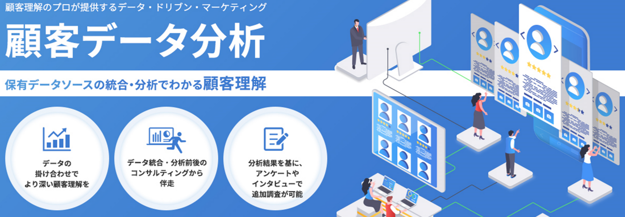 調査会社として年間6,600件以上のデータ分析に関わっており、その顧客理解のノウハウを基に、データ分析前の段階からクライアントに伴走します。アンケート調査やインタビュー調査などと掛け合わせたペルソナ理解もできるのが特長です。