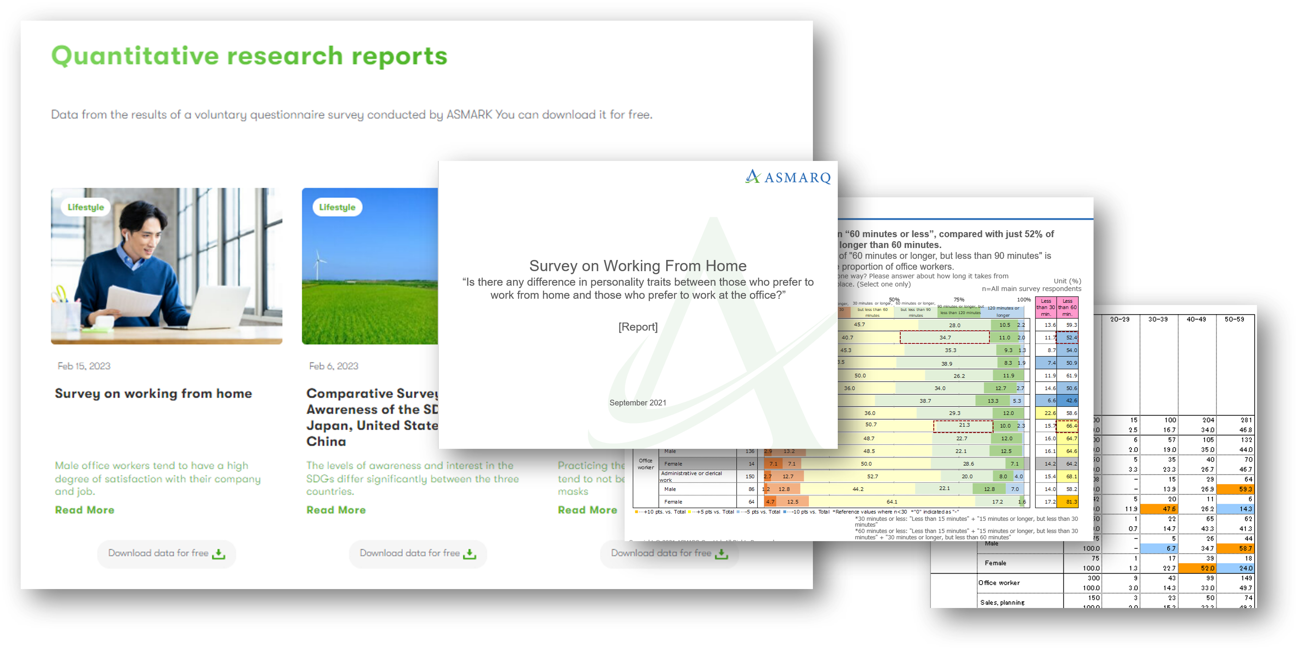 アスマークでは自社のモニターに向け行ったwebアンケート調査を定期発行しています。今回は、サイトリニューアルに向け、実施した独自の自主アンケート調査結果のラインナップを更に展開。全て無料でダウンロードいただき、ご活用にお役立ていただけます。