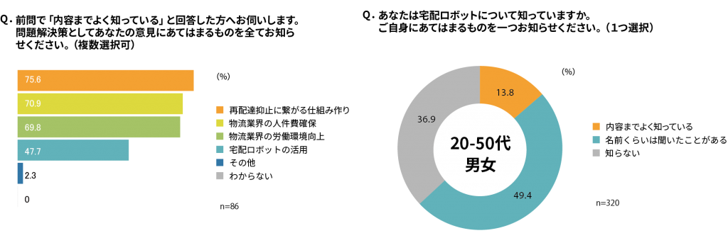 宅配ロボットに関しては6割以上の方が「内容までよく知っている」「名前くらいは聞いたことがある」と回答しており、