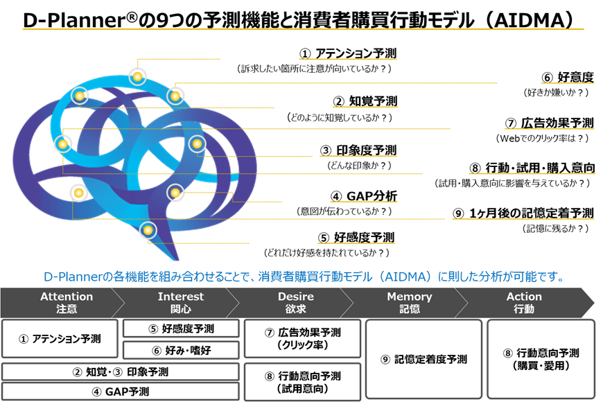 D-Planner®を用いることで従来定量化が難しかった消費者や視聴者の反応をクラウドで瞬時に予測することで、多量なデザイン案から最も効果的なデザインの選定や、デザイン案の改善のための示唆を得ることが可能です。