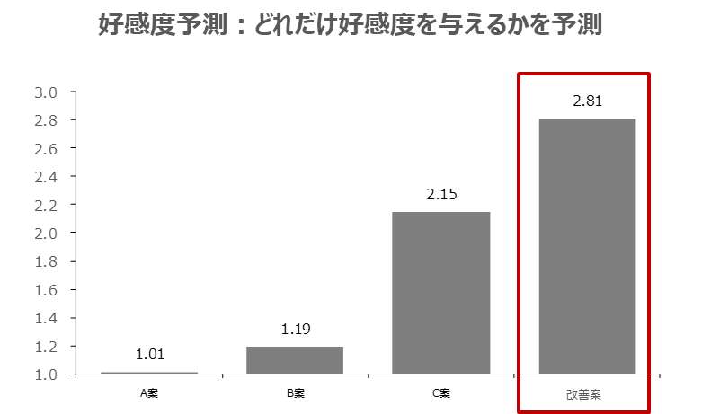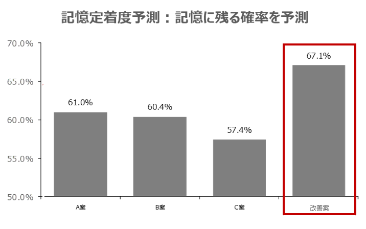 | 効果 | 発売後1ヶ月間で、改善案の導入店舗の売上が非導入店舗と比較して8.5倍となった。(売上は店舗での商品の展開数量や展開位置、各店舗の立地条件や規模などの影響もあるが、期間中のPOSとして) 主観的な方法のみでは判断が難しかったデザイン評価にNeuroAI® D-Planner®が活用できる可能性を示唆 |