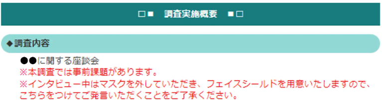 調査依頼元の希望として「マスク着脱いずれかが必須」の調査時には、冒頭の調査概要提示画面に赤字でその旨を記載いたします。