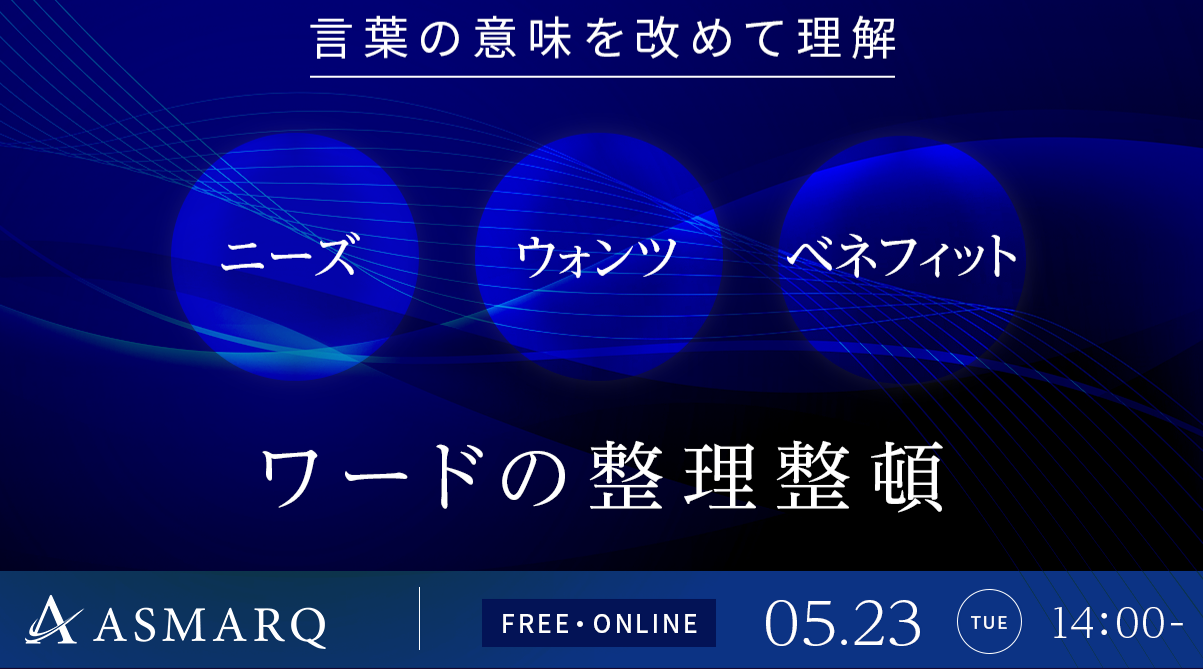 株式会社アスマーク(東京都渋谷区東、代表取締役:町田正一)は、2023年5月23日(火)14:00に「ワードの整理整頓」と題し、用語定義や使い分けの再提唱を通じて消費者行動のリサーチが深まる、リサーチャーによるマーケティング用語の解説セミナーを開催いたします。