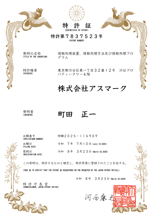 株式会社アスマーク(代表取締役:町田正一、所在地:東京都渋谷区、以下「当社」)は、生成AI(人工知能)および自然言語処理技術を活用し、マーケティングリサーチプロセスを根本から変革する「調査プロセス全自動化プラットフォーム」の基幹技術について、特許を取得いたしましたので下記のとおりお知らせいたします。