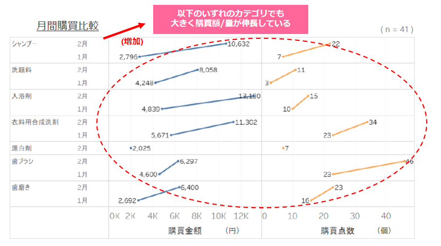 マスクを求めてのドラッグストア利用機会の増加に伴う影響もあるが、「シャンプー」や「洗顔料」、「衣料用合成洗剤」といった身体を清潔に保つ商品や、「漂白剤」「歯ブラシ」「歯磨き」といった衛生系商品の売上が顕著に伸びており、漂白殺菌効果や身辺を清潔に保つという意識がこれらのジャンルの消費を押し上げている可能性がある。