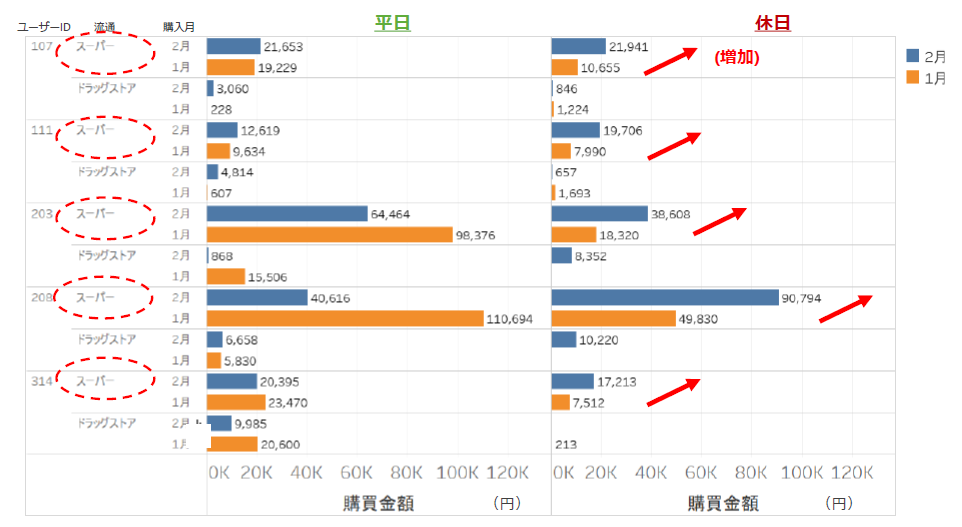 ・休日の購買内容をより詳細に追っていくと、やはり前項にて述べた「米」や「野菜」「レトルト系食品」といった商品を中心に購買額が増加している事が分かった。