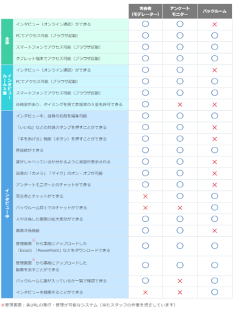 調査モニターとの対面インタビューや分析を得意とし、オフライン定性調査に強い実績を持つアスマークだからこそできた初の調査専用システム。バックルーム環境の充実や、モデレーター目線など、リアルな使い心地を追求しています。