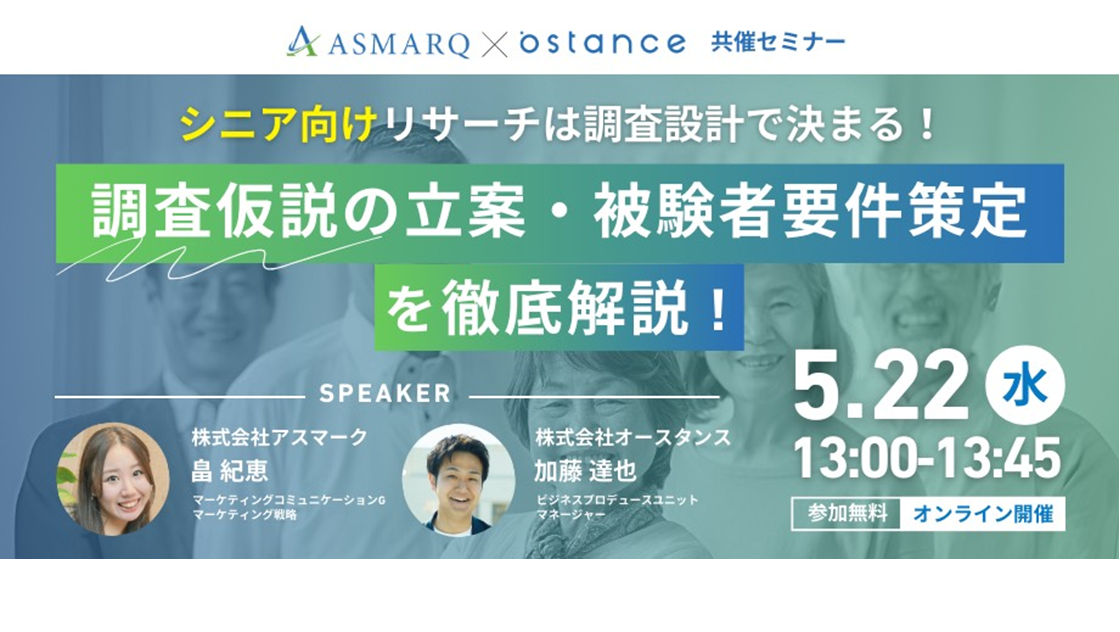株式会社アスマーク(東京都渋谷区東、代表取締役:町田正一)は、2024年5月22日(水)13:00に、国内最大級のシニア向けコミュニティサービスを提供する、株式会社オースタンス(本社:東京都渋谷区/代表取締役社長:菊川諒人)と共催形式で、「シニアに向けた、調査仮説の立案や被験者要件策定の手法」をテーマにセミナーを実施いたします。