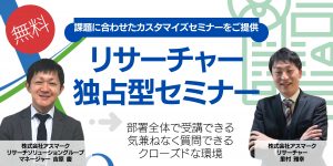 株式会社アスマーク(東京都渋谷区東、代表取締役:町田正一)は、リサーチソリューショングループ・マネージャー吉原を筆頭に、当社リサーチャーによる個社別のリサーチ課題に合わせた無料セミナー提供を開始いたします。