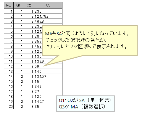 弊社で集計を行う際、MA(複数選択)のローデータはASSUM用に0,1形式になっています。