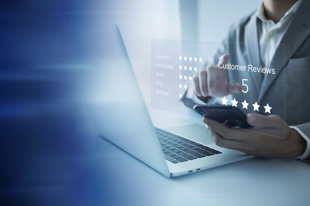 Satisfaction and customer service survey concept, business people using laptop and smartphone. to answer the questionnaire And the satisfaction rating, the satisfaction rating with the icon 5 stars.