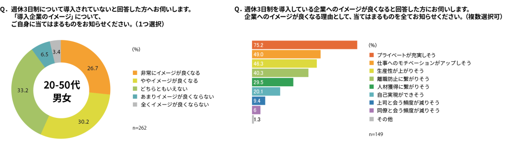 次に、「週休3日制が導入されていない」と回答した方に、「導入企業のイメージ」に関して質問をしたところ、半数以上が「イメージが良くなる(計)」と答えました。また、約3割が「どちらともいえない」と回答しておりました。