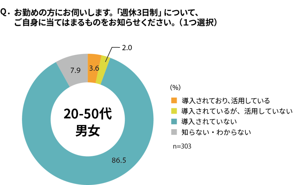 まず、週休3日制の導入状況について、対象者の8割以上が「導入されていない」と答えました。一方で、「導入されている(計)」と回答した方は、約5%となり、未だ広く普及しているとは言い難い状況が伺えます。